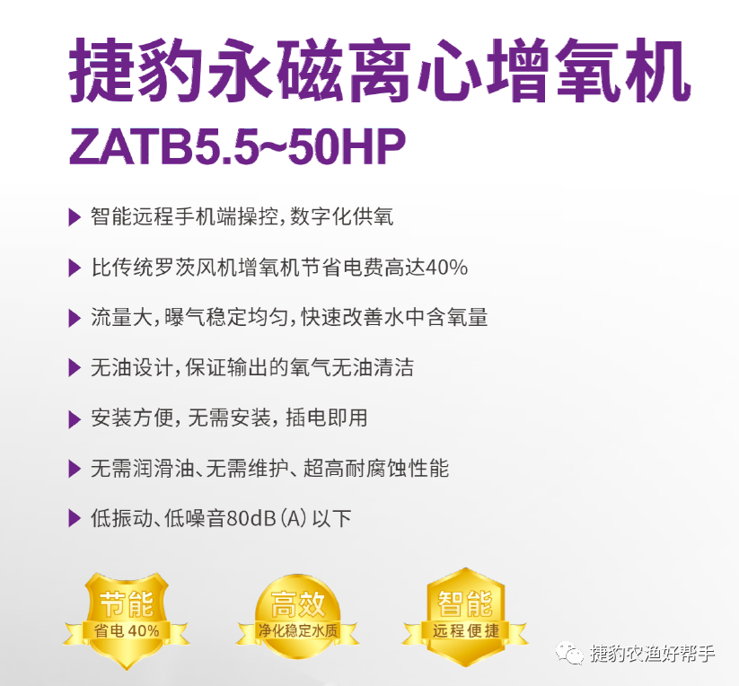 捷豹永磁離心增氧機(jī),能夠?yàn)榻o養(yǎng)蝦池源源不斷的提供空氣,保證池內(nèi)充足的溶解氧,相比老式的羅茨增氧機(jī)效率更高,噪音更低。