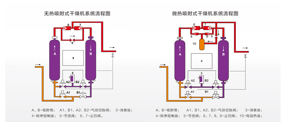 吸附式干燥機穩(wěn)定一致的出氣壓力和低露點:特有的氧化鋁、分子篩配比分層技術(shù),使空氣首先經(jīng)過氧化鋁進行初步干燥,降低空氣中的含水量后,再經(jīng)過分子篩做深度干燥,達到更低露點的空氣品質(zhì)。合適的塔體尺寸和上游干燥、下游再生的對流方式,無熱再生排氣量小于 14%,微熱再生排氣量僅為 5%,避免吸附劑流化和吸附劑層受污染。